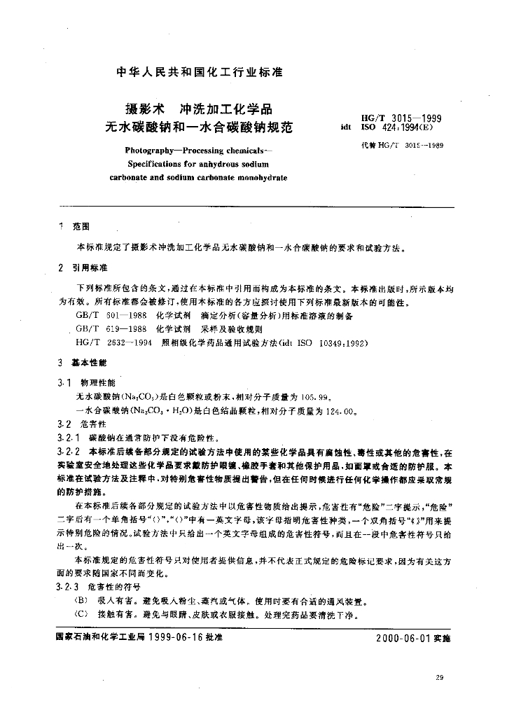 HG/T 3015-1999 摄影术 冲洗加工化学品 无水碳酸钠和一水合碳酸钠规范