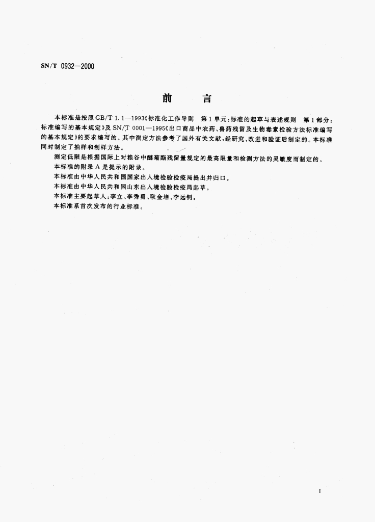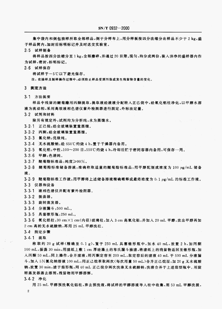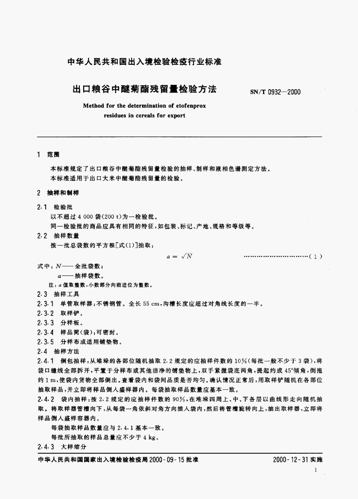 SN/T 0932-2000 出口粮谷中醚菊酯残留量检验方法