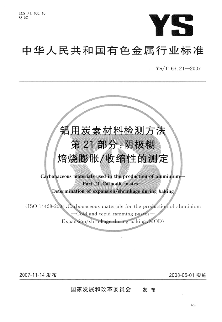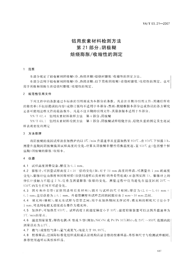YS/T 63.21-2007 铝用炭素材料检测方法 第21部分:阴极糊 焙烧膨胀/收缩性的测定
