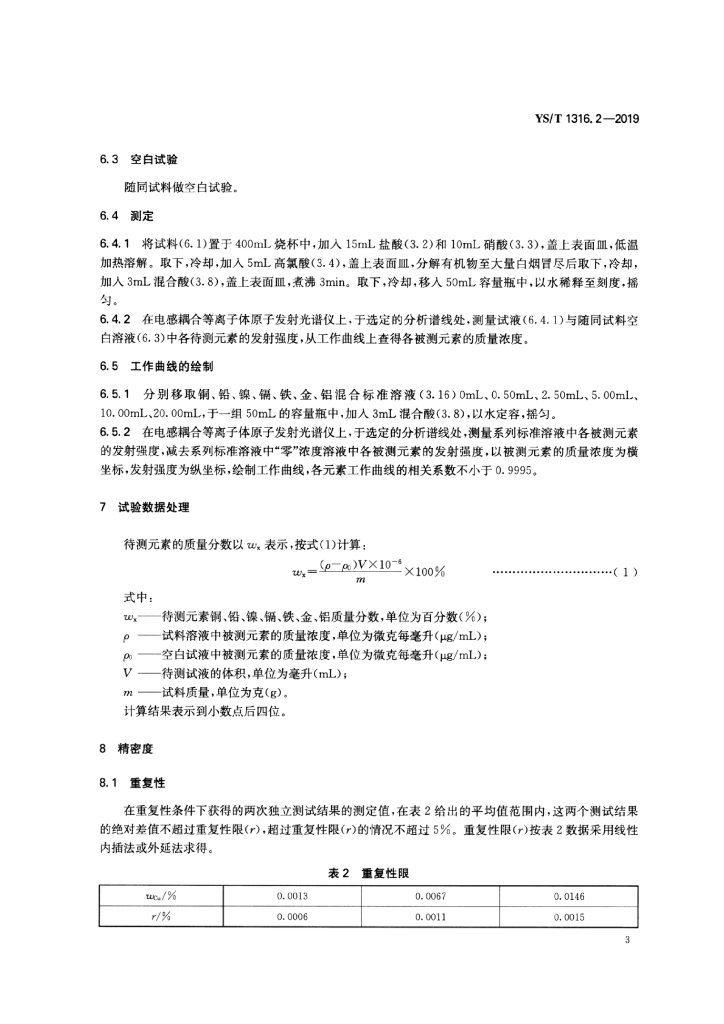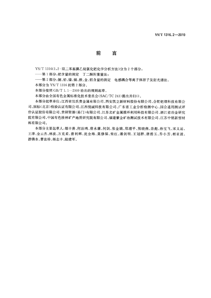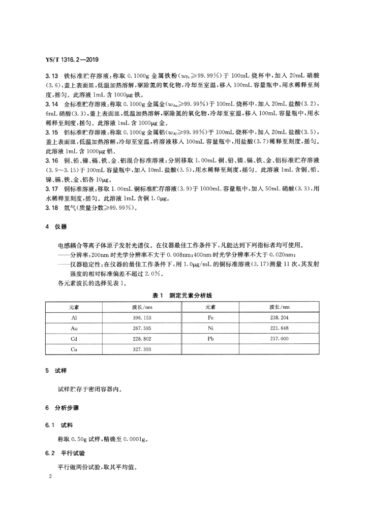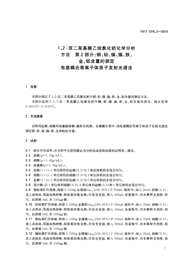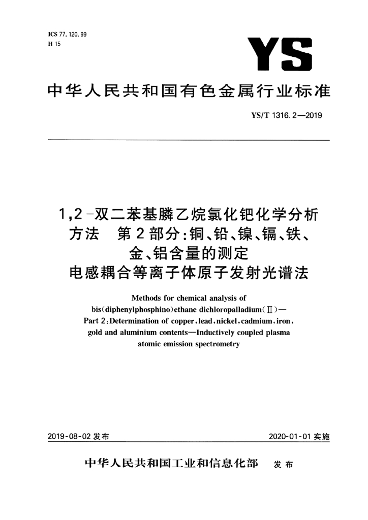 YS/T 1316.2-2019 1,2-双二苯基膦乙烷氯化钯化学分析方法 第2部分:铜、铅、镍、镉、铁、金、铝含量的测定