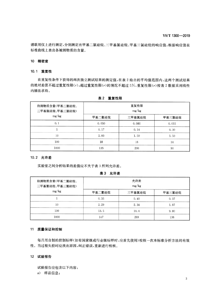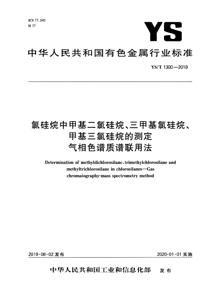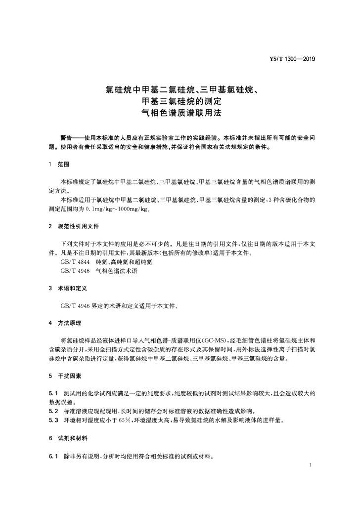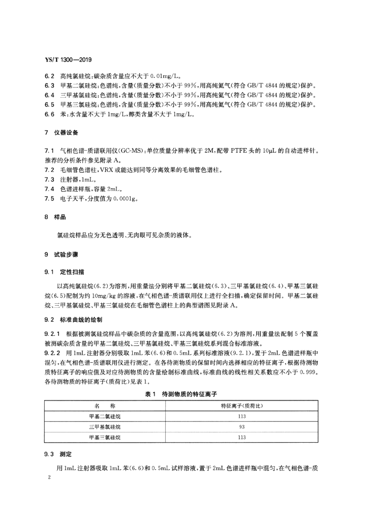 YS/T 1300-2019 氯硅烷中甲基二氯硅烷、三甲基氯硅烷、甲基三氯硅烷的测定 气相色谱质谱联用法