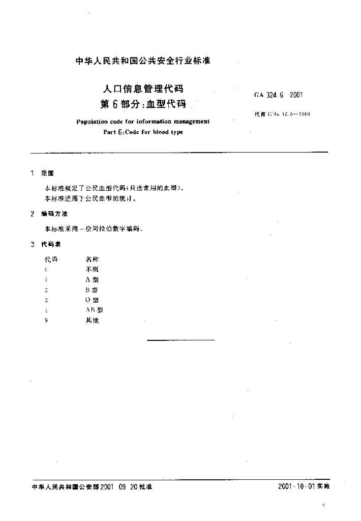 GA 324.6-2001 人口信息管理代码 第6部分 血型代码