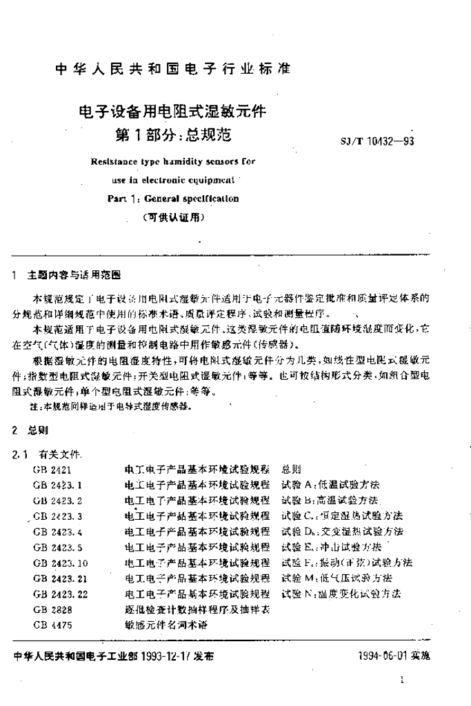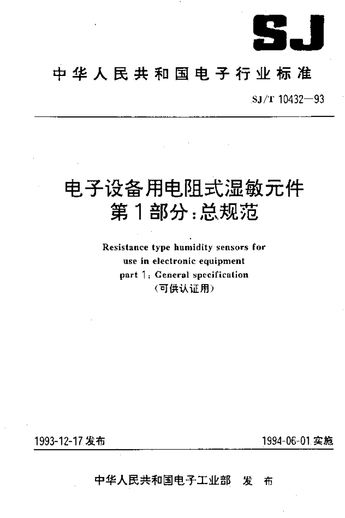 SJ/T 10432-1993 电子设备用电阻式湿敏元件 第1部分:总规范