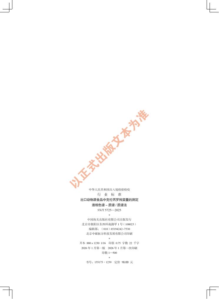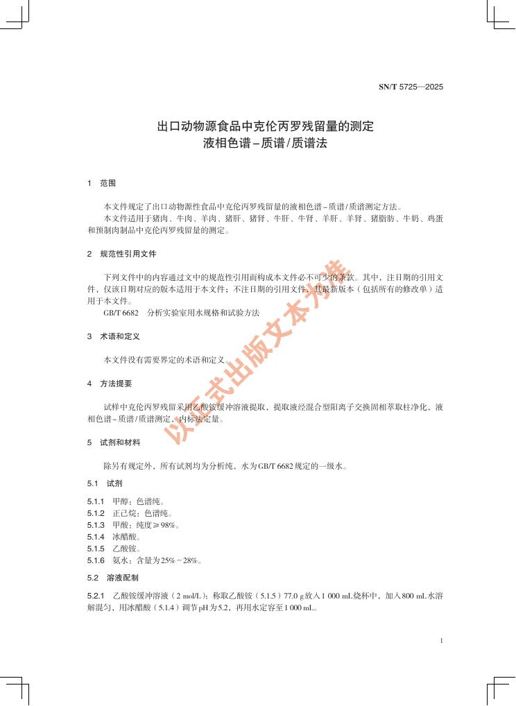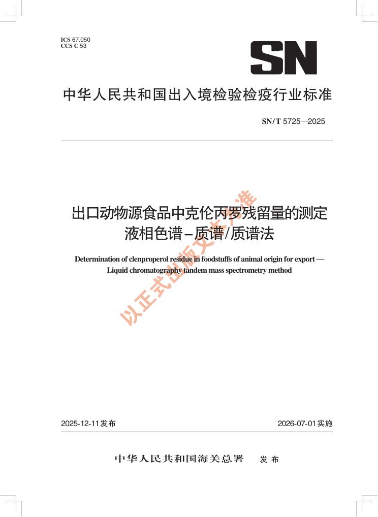 SN/T 5725-2025 出口动物源食品中克伦丙罗残留量的测定 液相色谱-质谱/质谱法