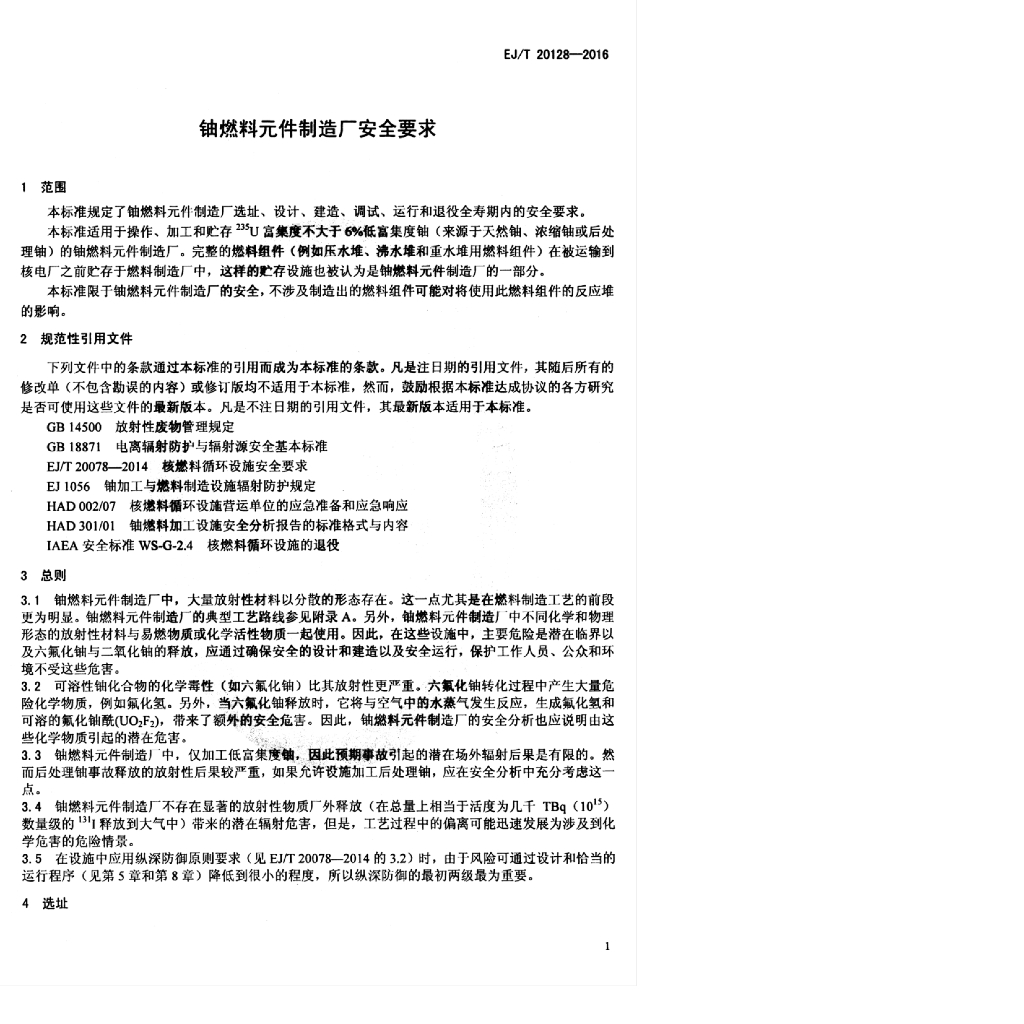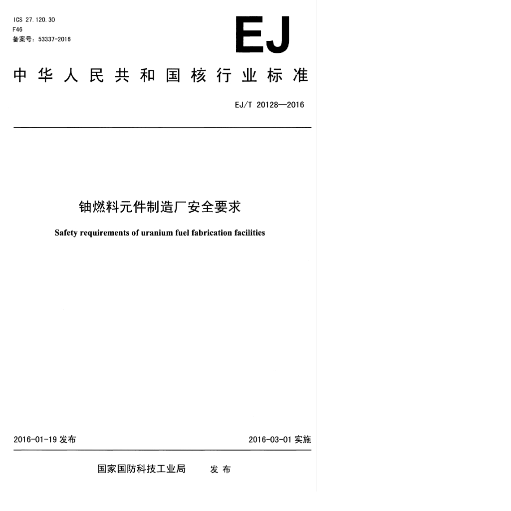 EJ/T 20128-2016 铀燃料元件制造厂安全要求