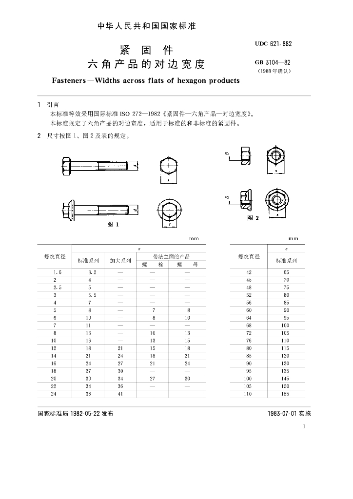 GB/T 3104-1982 紧固件 六角产品的对边宽度