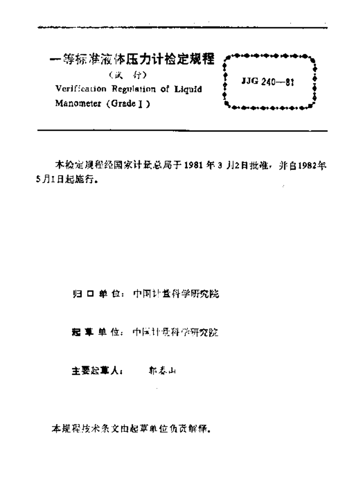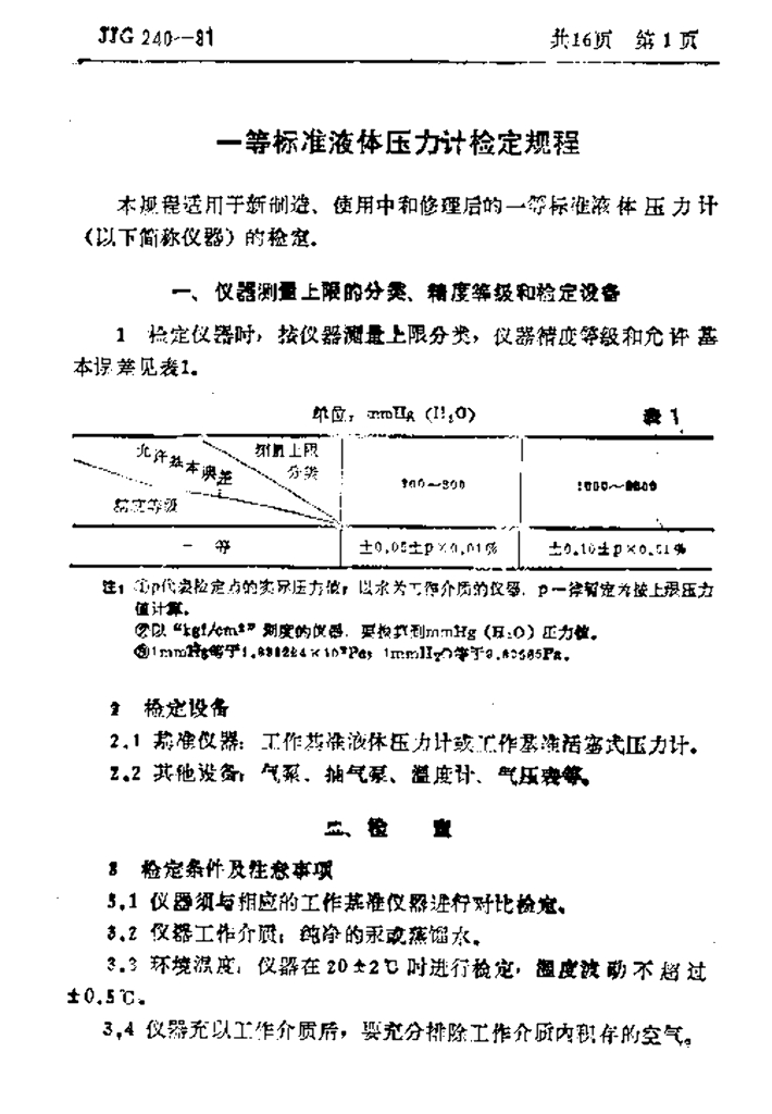 JJG 240-1981 一等标准液体压力计试行检定规程