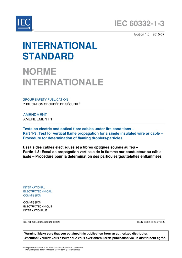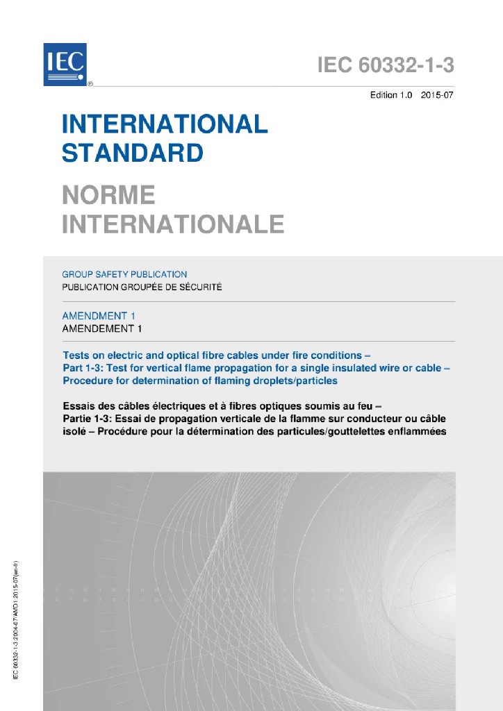 IEC 60332-1-3:2004+AMD1:2015 在火焰条件下电缆和光缆的试验 第1-3部分:单根绝缘电线或电缆的垂直燃烧试验-燃烧滴落物 颗粒的测定程序