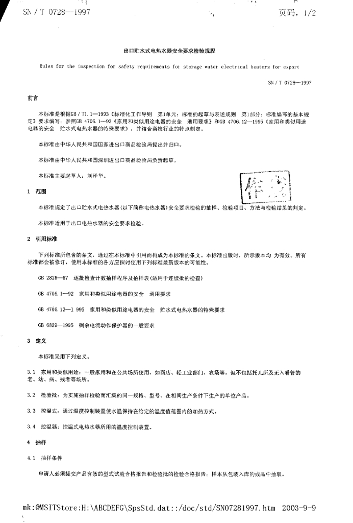 SN/T 0728-1997 出口贮水式电热水器安全要求检验规程