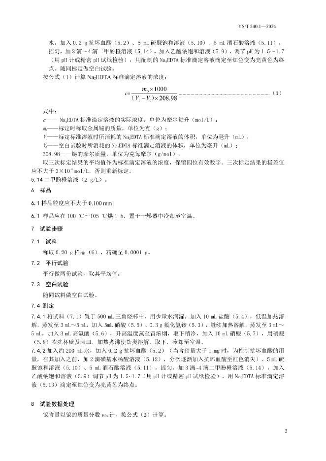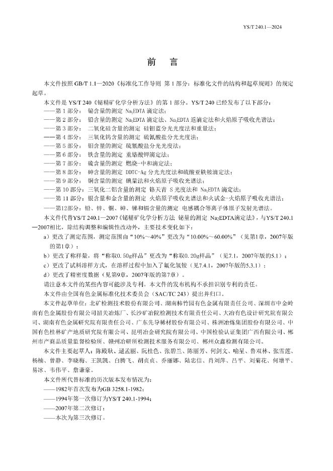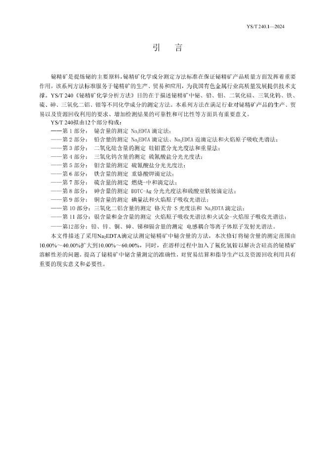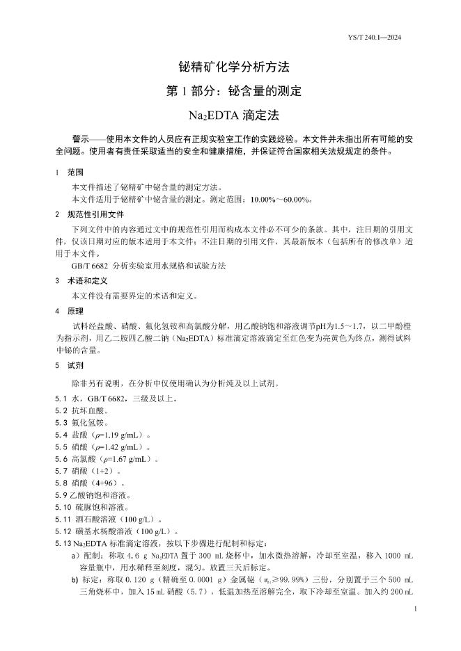 YS/T 240.1-2024 铋精矿化学分析方法 第1部分:铋含量的测定 Na2EDTA滴定法