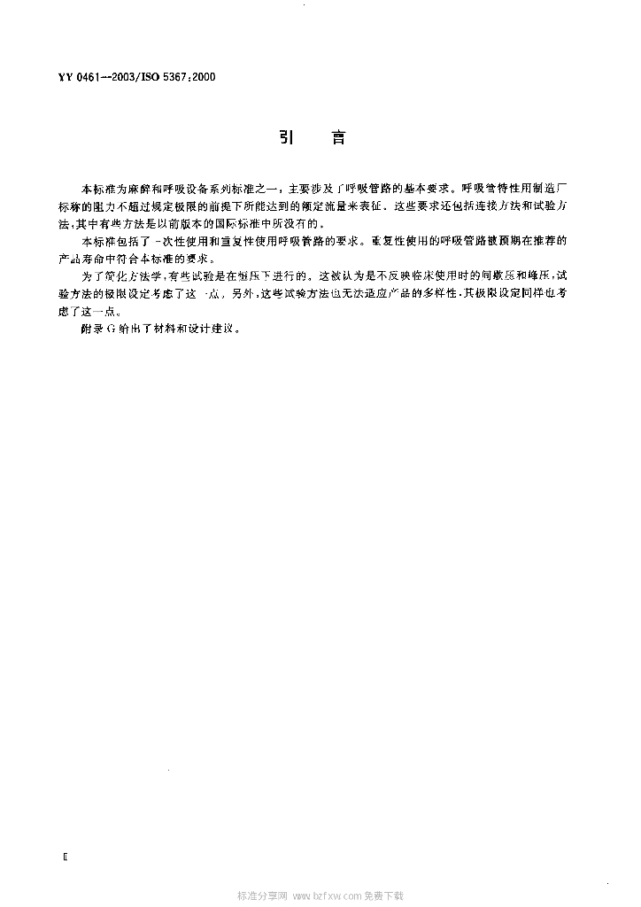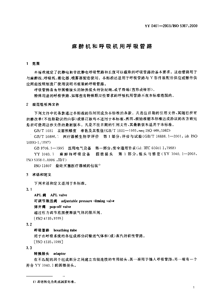YY 0461-2003/ISO 5367 :2000 麻醉机和呼吸机用呼吸管路