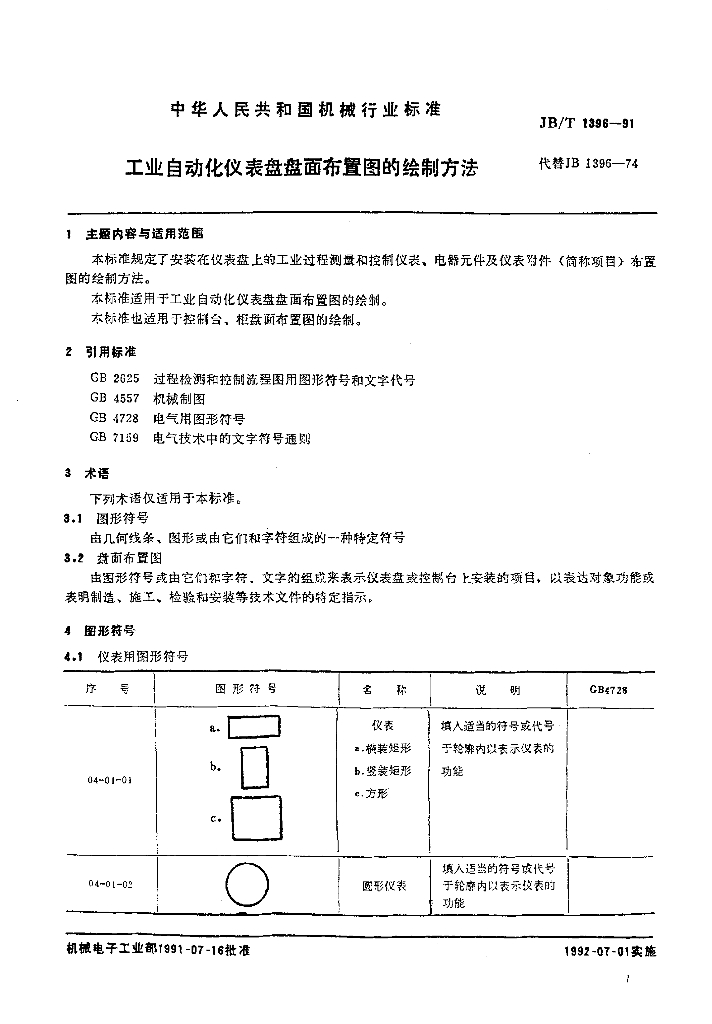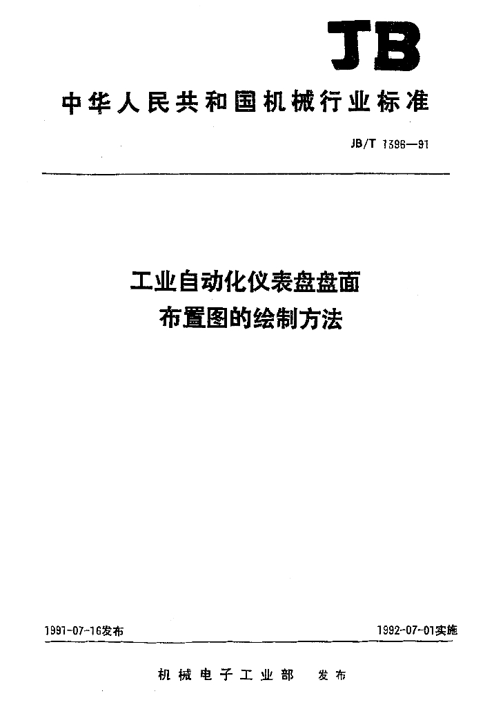 JB/T 1396-1991 工业自动化仪表盘 盘面布置图的绘制方法