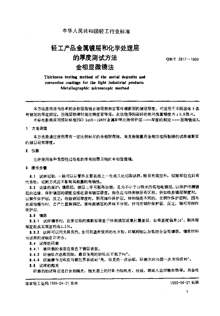 QB/T 3817-1999 轻工产品金属镀层和化学处理层的厚度测试方法金相显微镜法