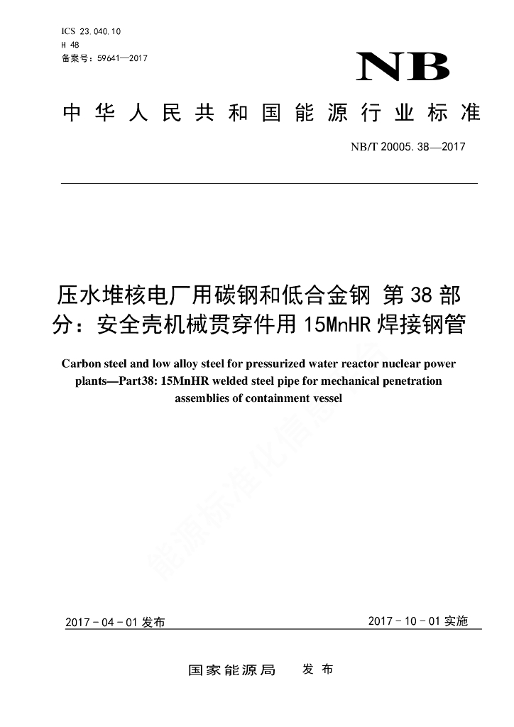 NB/T 20005.38-2017 压水堆核电厂用碳钢和低合金钢 第38部分:安全壳机械贯穿件用15MnHR焊接钢管