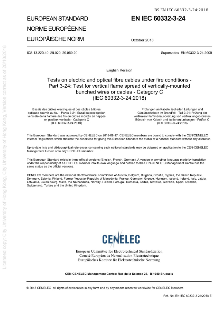IEC 60332-3-24:2018 电缆和光缆在火焰条件下的燃烧试验 第3-24部分 垂直安装的成束电线或电缆的垂直火焰蔓延试验 C类