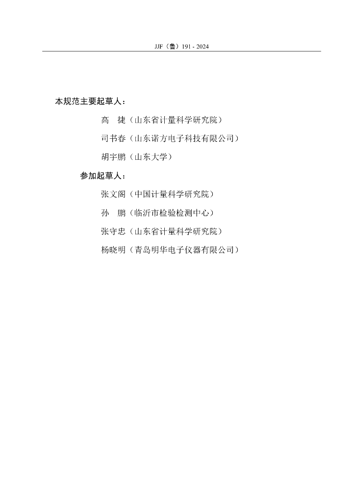 高捷(山东省计量科学研究院)、司书春(山东诺方电子科技有限公司)、胡宇鹏(山东大学)、张文阁(中国计量科学研究院)、孙鹏(临沂市检验检测中心)、张守忠(山东省计量科学研究院)、杨晓明(青岛明华电子仪器有限公司)