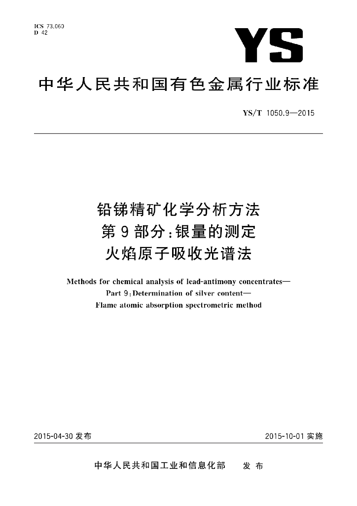 YS/T 1050.9-2015 铅锑精矿化学分析方法 第9部分:银量的测定 火焰原子吸收光谱法
