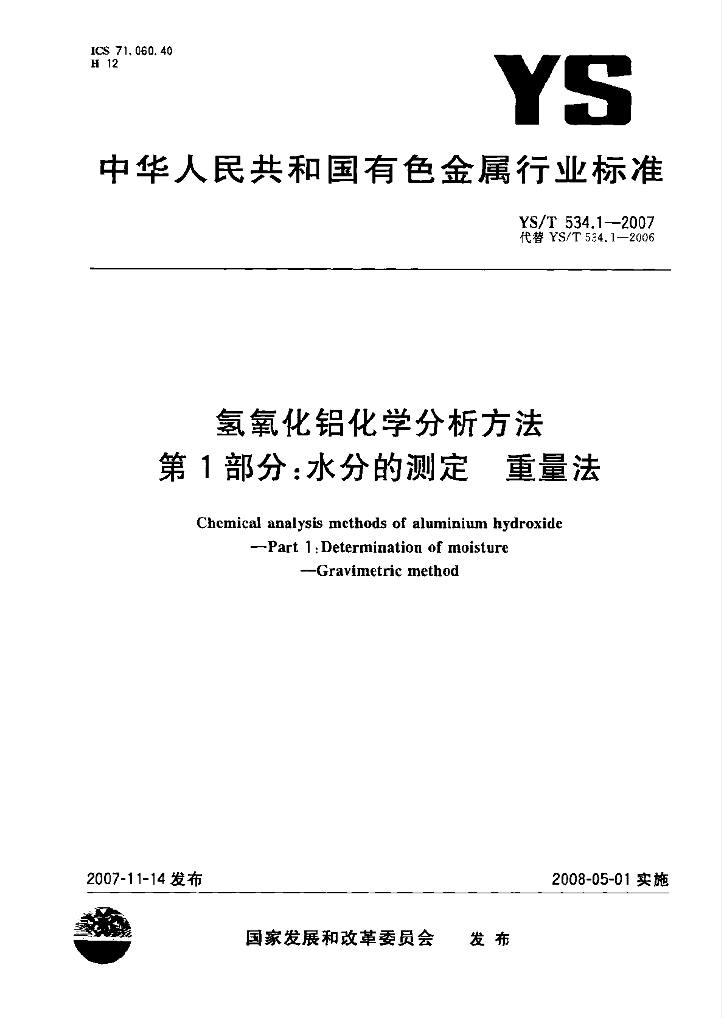 YS/T 534.1-2007 氢氧化铝化学分析方法 第1部分:水分的测定 重量法