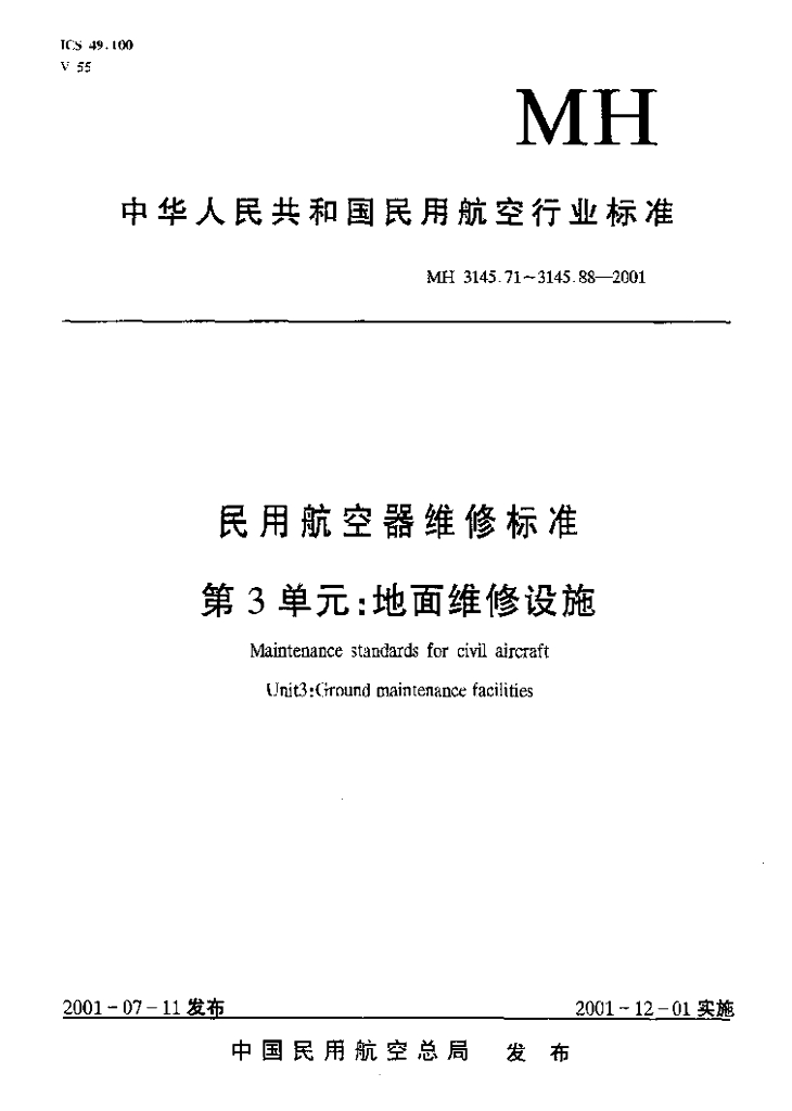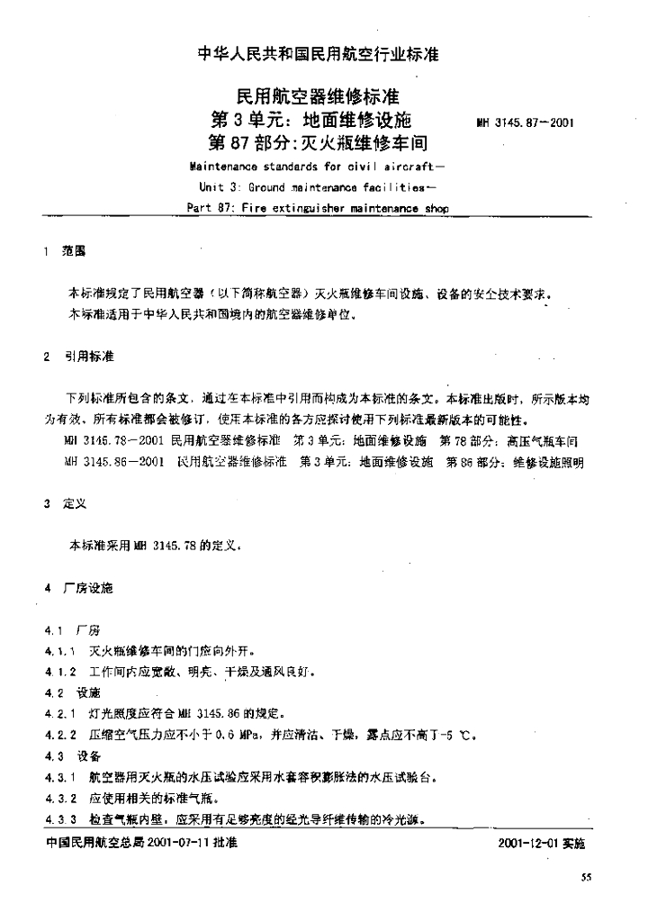 MH 3145.87-2001 民用航空器维修标准 第3单元 地面维修设施 第87部分 灭火瓶维修车间
