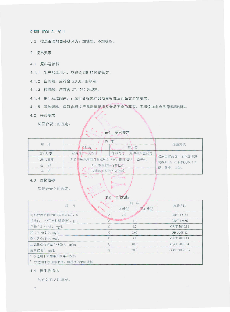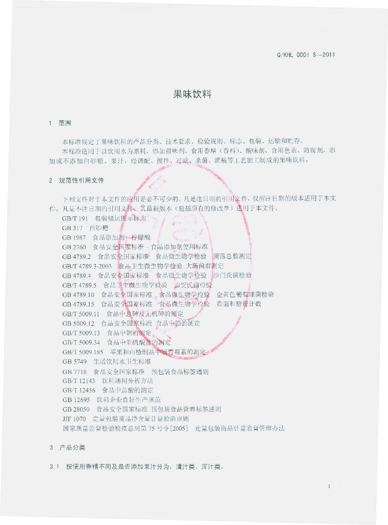 Q/KHL 0001S-2011 果味饮料
