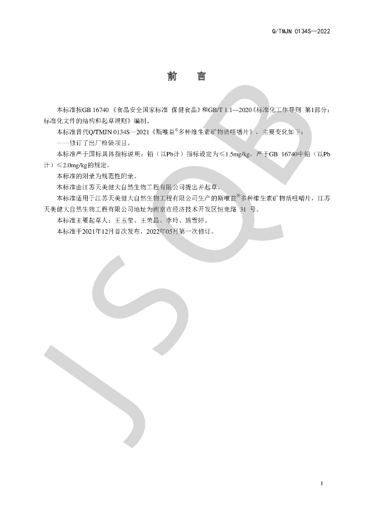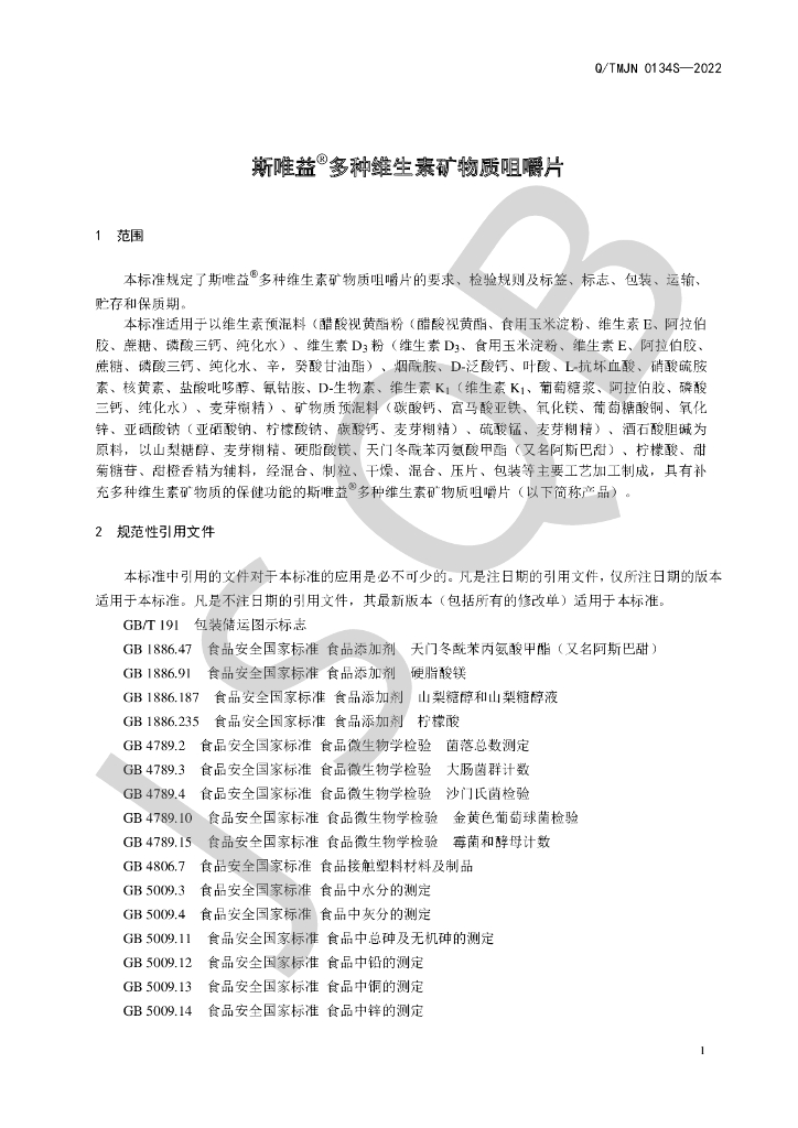 Q/TMJN 0134S-2022 斯唯益®多种维生素矿物质咀嚼片