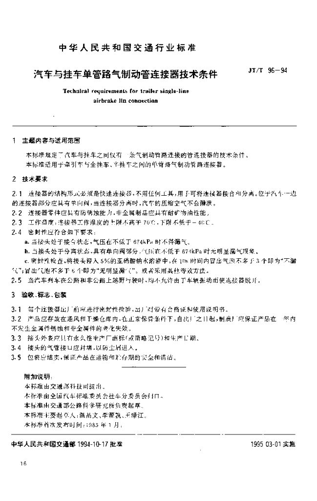 JT/T 96-1994 汽车与挂车单管路气制动管连接器技术条件