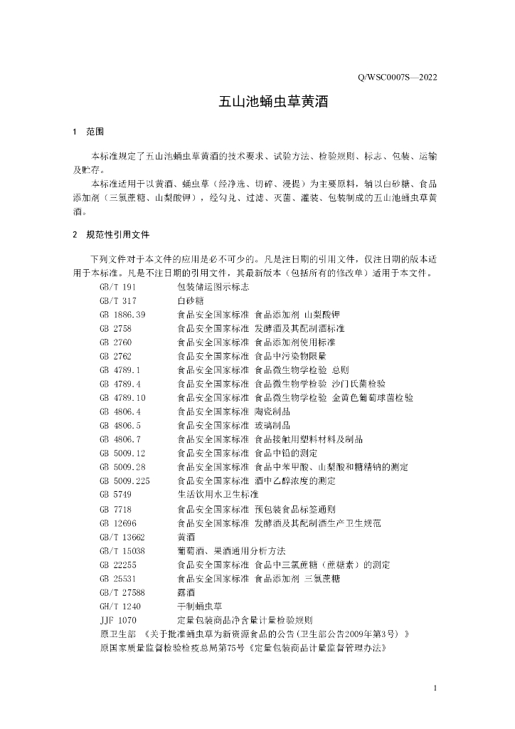 Q/WSC 0007S-2022 五山池蛹虫草黄酒