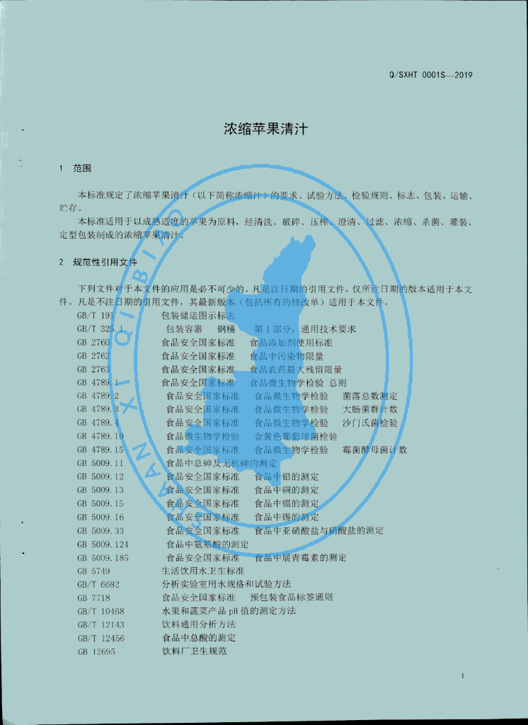 Q/SXHT 0001S-2019 浓缩苹果清汁