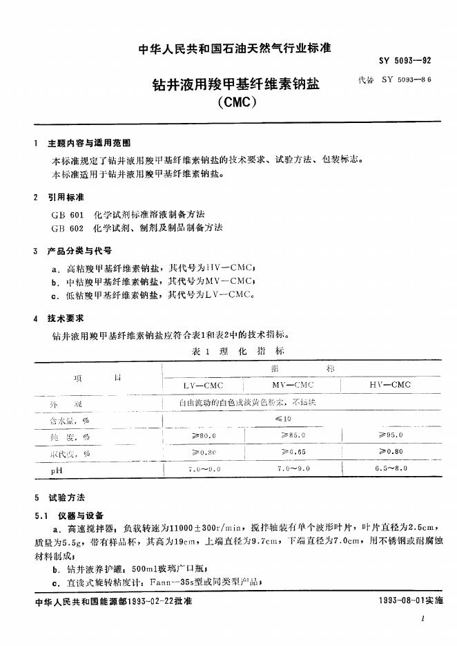 SY 5093-1992 钻井液用羧甲基纤维素钠盐