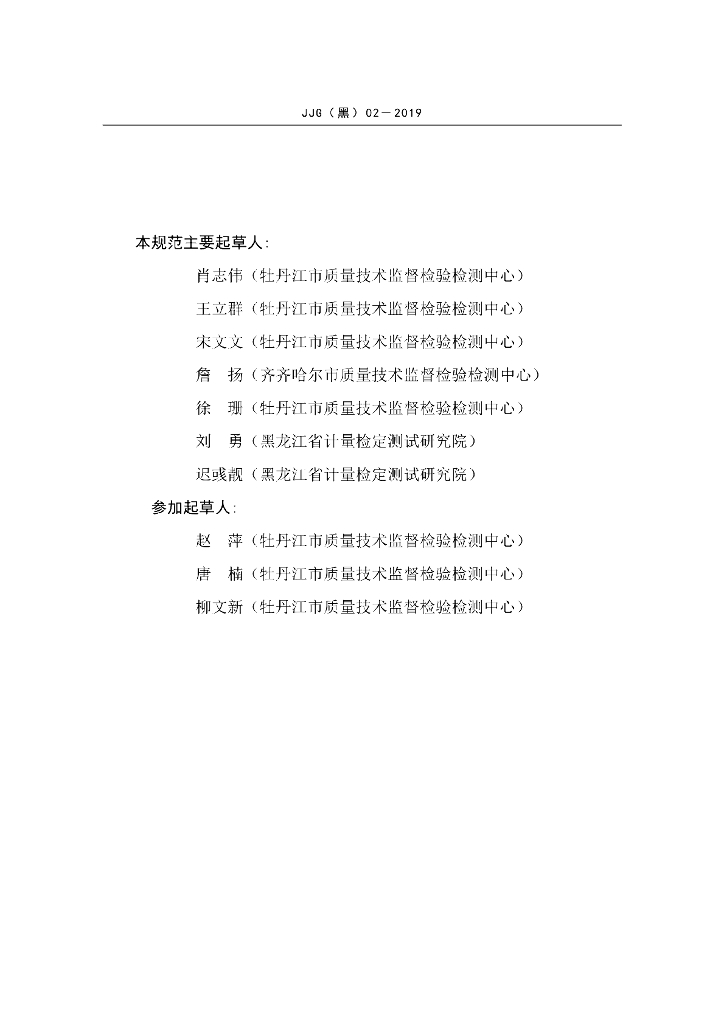 肖志伟(牡丹江市质量技术监督检验检测中心)、王立群(牡丹江市质量技术监督检验检测中心)、宋文文(牡丹江市质量技术监督检验检测中心)、詹扬(齐齐哈尔市质量技术监督检验检测中心)、徐珊(牡丹江市质量技术监督检验检测中心)、刘勇(黑龙江省计量检定测试研究院)、迟彧靓(黑龙江省计量检定测试研究院)、赵萍(牡丹江市质量技术监督检验检测中心)、唐楠(牡丹江市质量技术监督检验检测中心)、柳文新(牡丹江市质量技术监督检验检测中心)