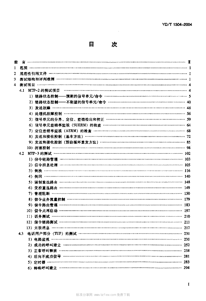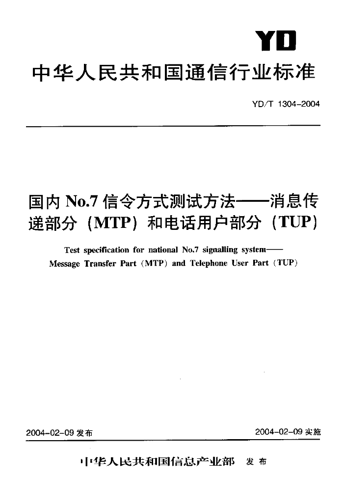YD/T 1304-2004 国内 No.7 信令方式测试方法消息传递部分(MTP)和电话用户部分(TUP)