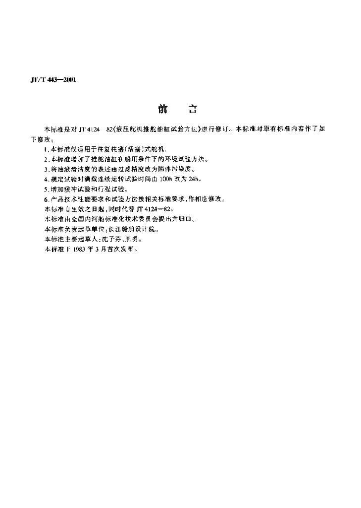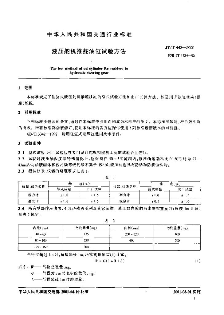 JT/T 443-2001 液压舵机推舵油缸试验方法
