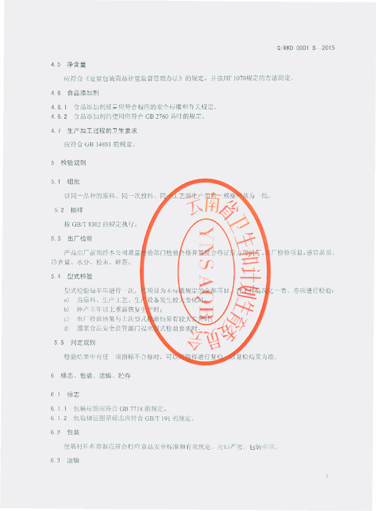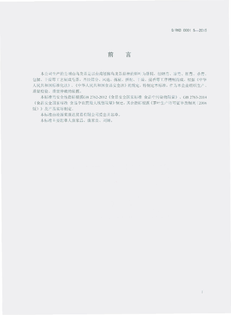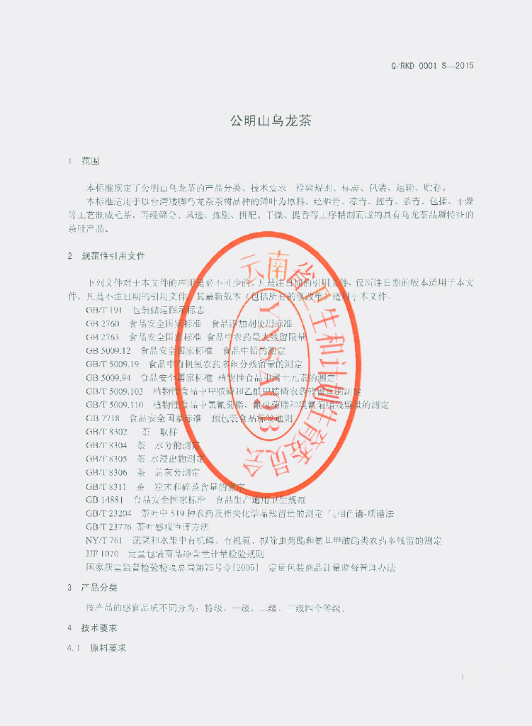 Q/RKD 0001S-2015 沧源荣康达贸易有限公司 公明山乌龙茶