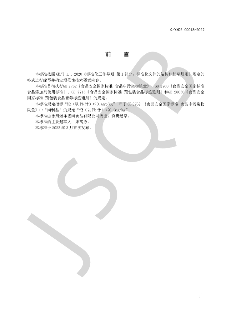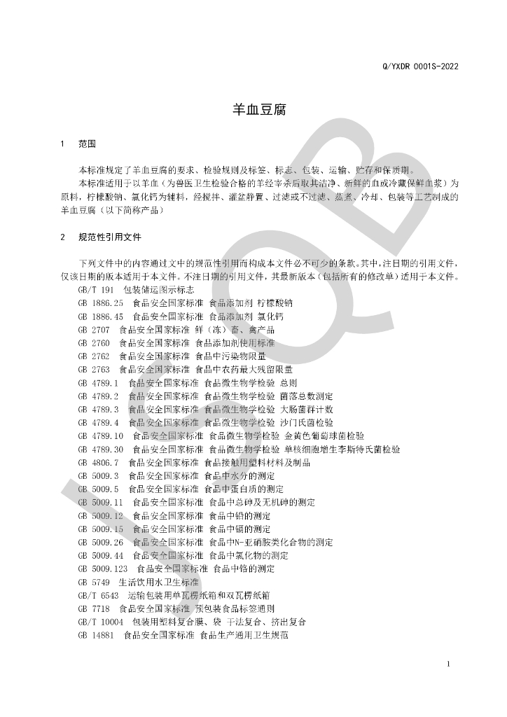 Q/YXDR 0001S-2022 羊血豆腐