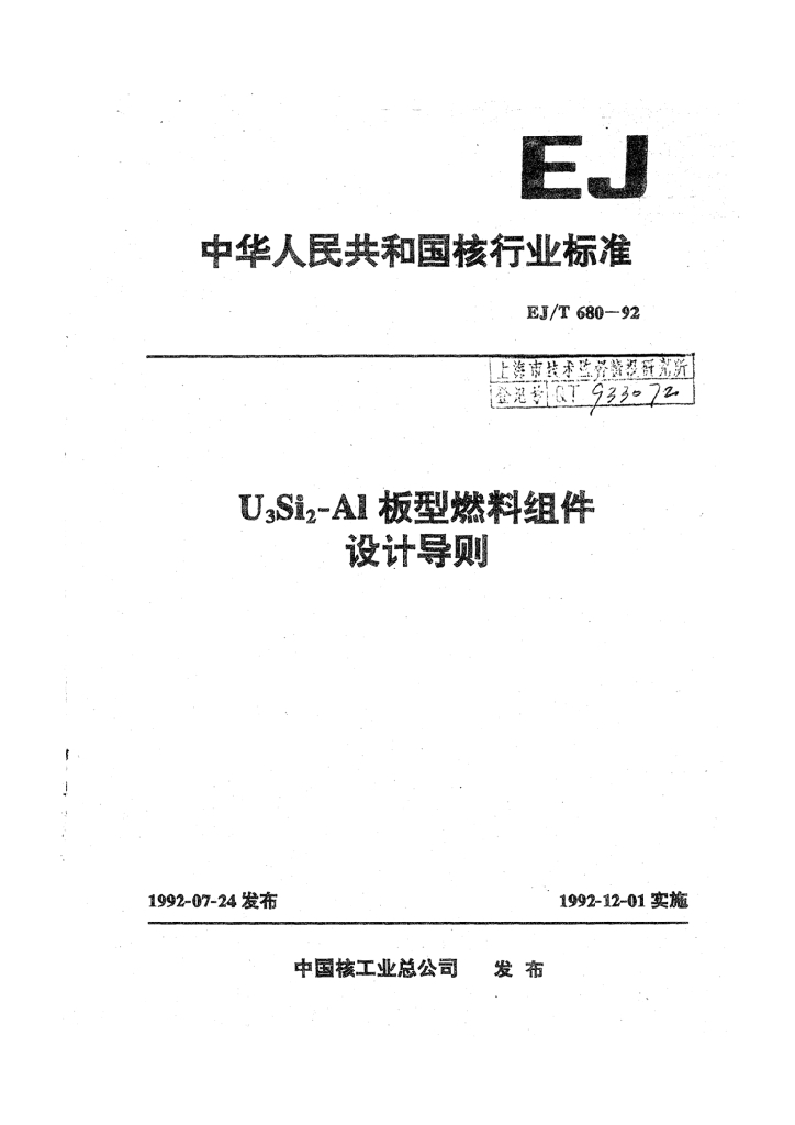 EJ/T 680-1992 U3Si2-Al板型燃料组件设计导则