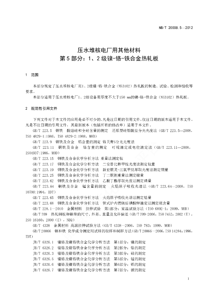 NB/T 20008.5-2012 压水堆核电厂用其他材料 第5部分:1、2级镍-铬-铁合金热轧板