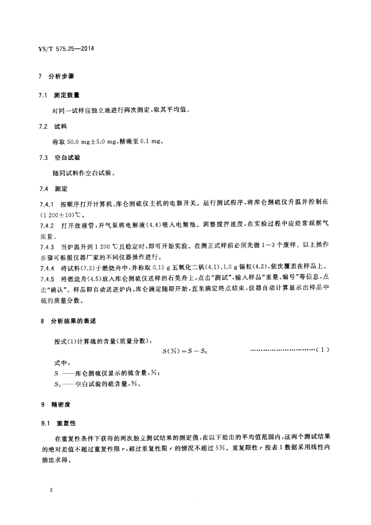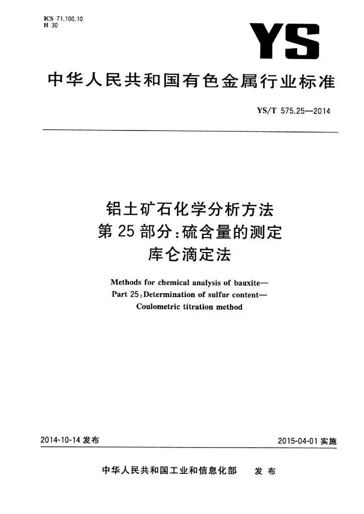 YS/T 575.25-2014 铝土矿石化学分析方法 第25部分:硫含量的测定库仑滴定法