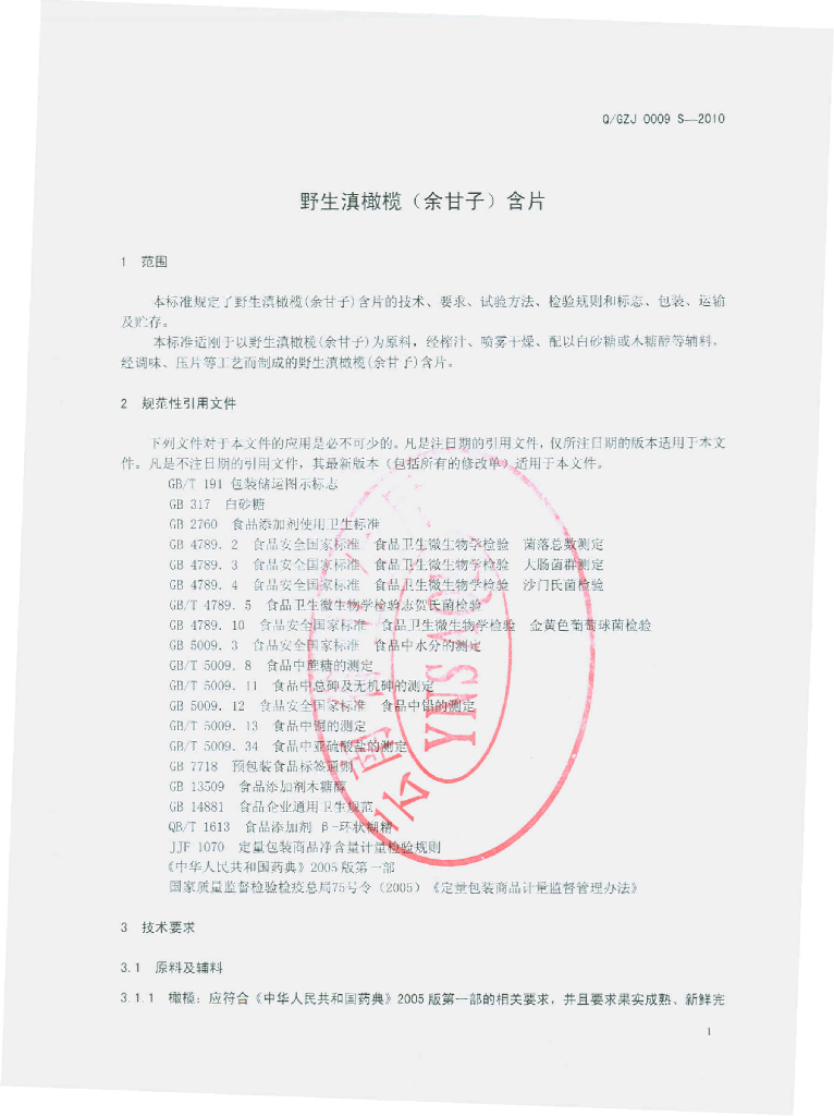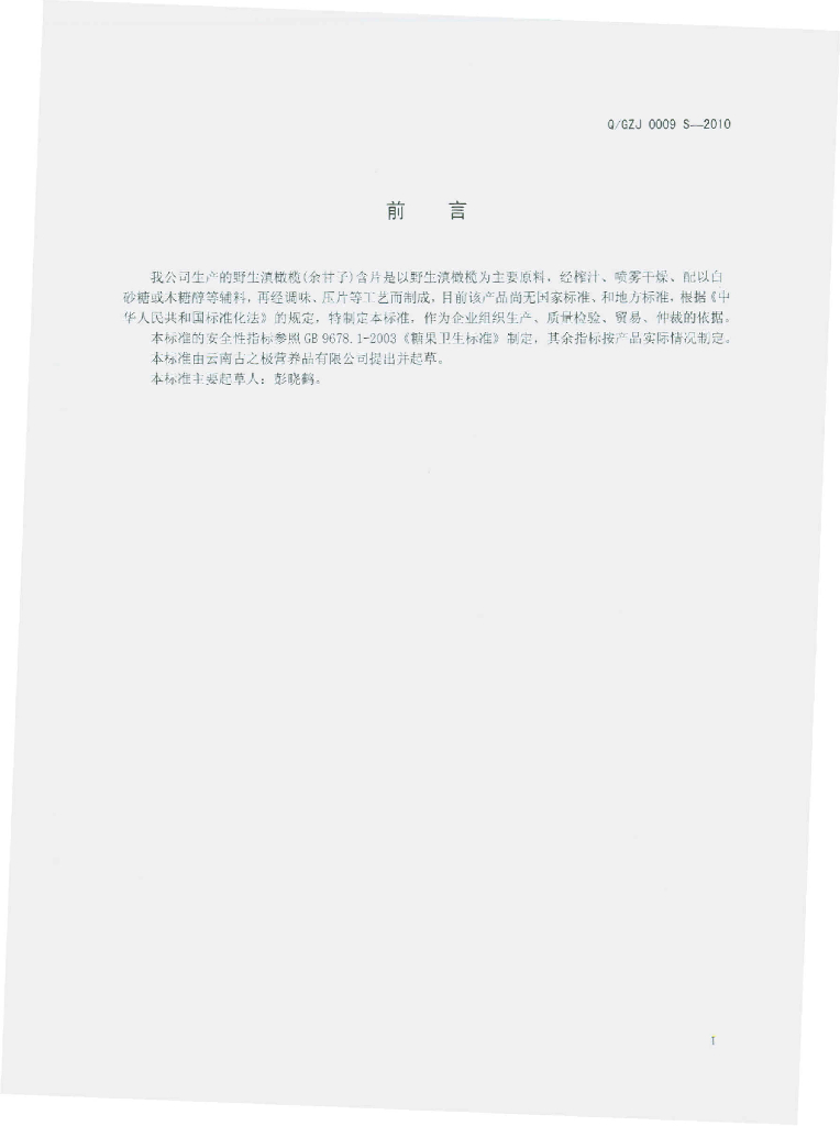 Q/GZJ 0009S-2010 野生滇橄榄(余甘子)含片