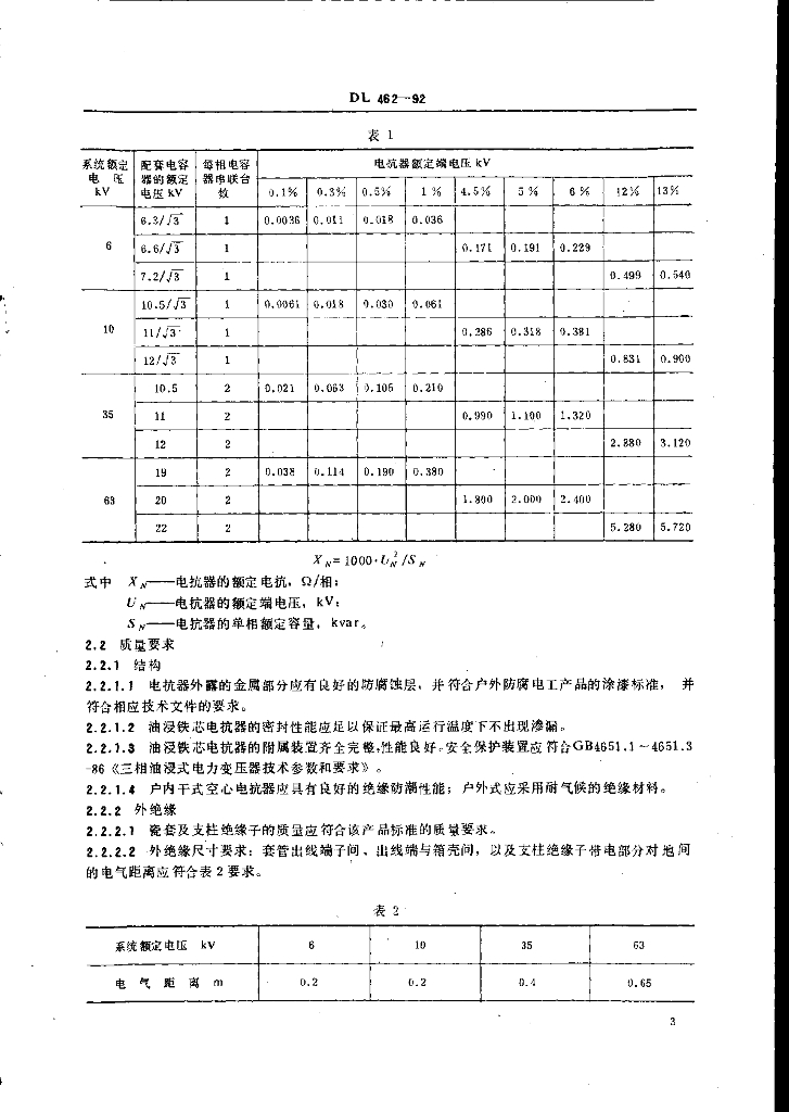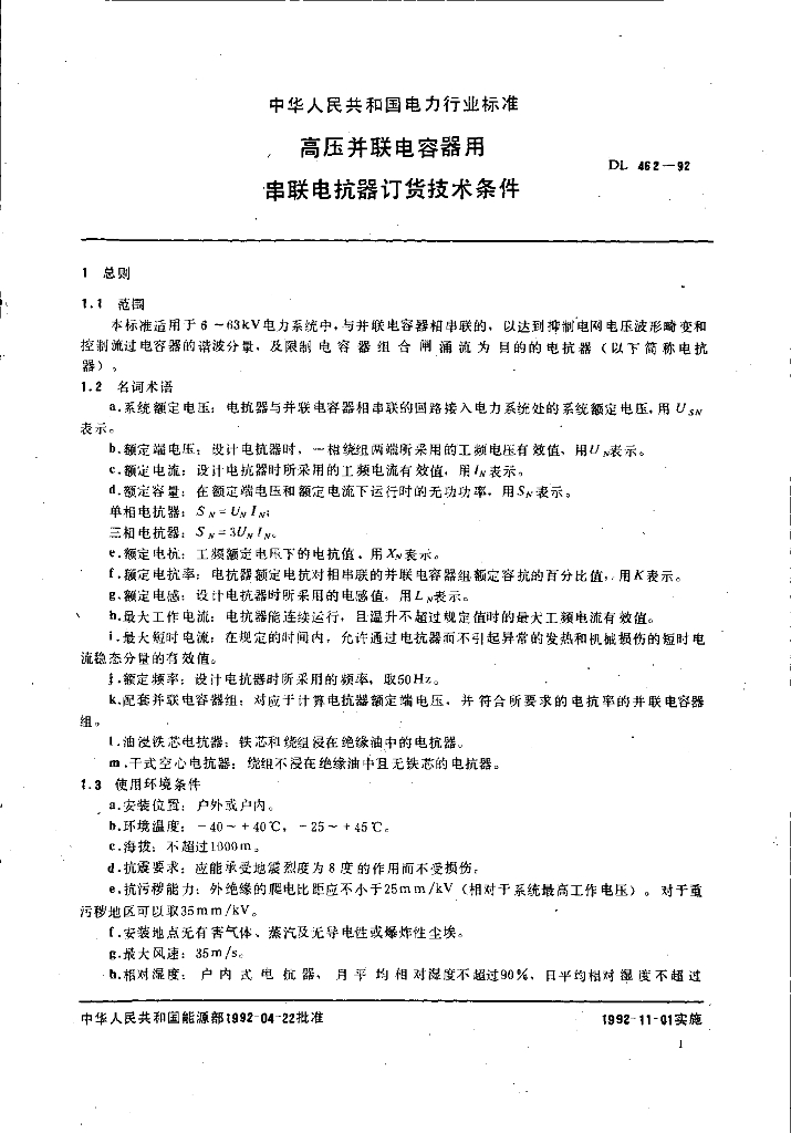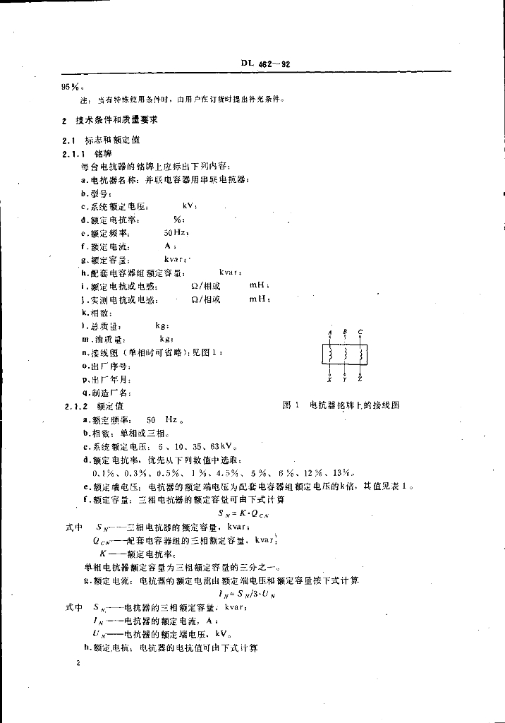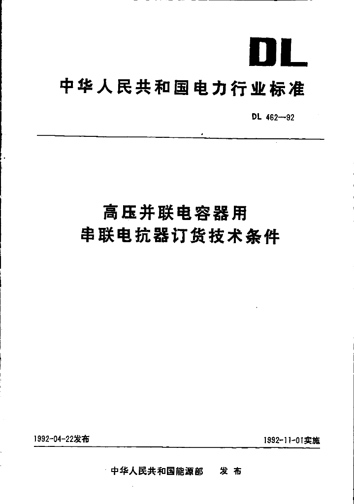 DL 462-1992 高压并联电容器用 串联电抗器订货技术条件