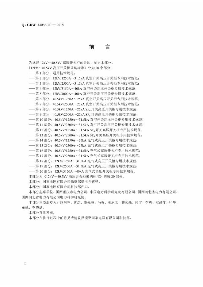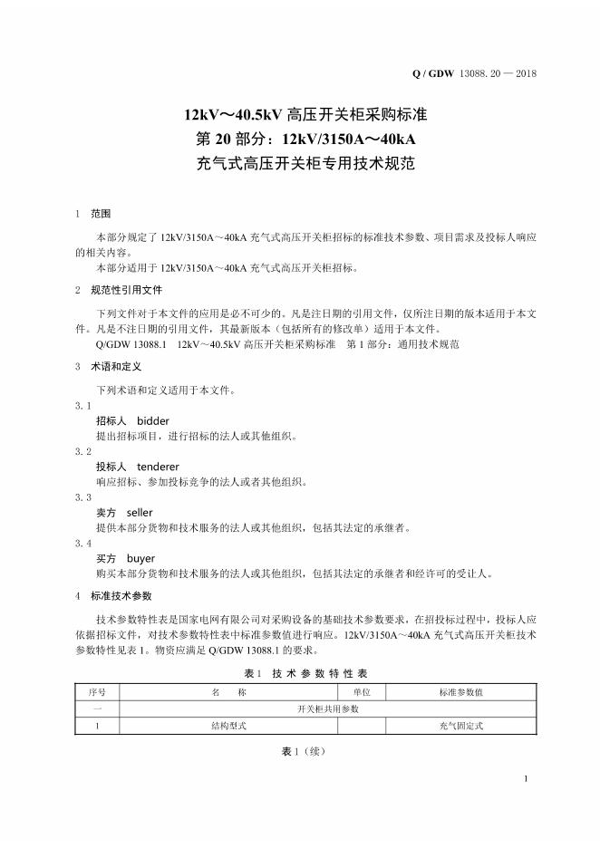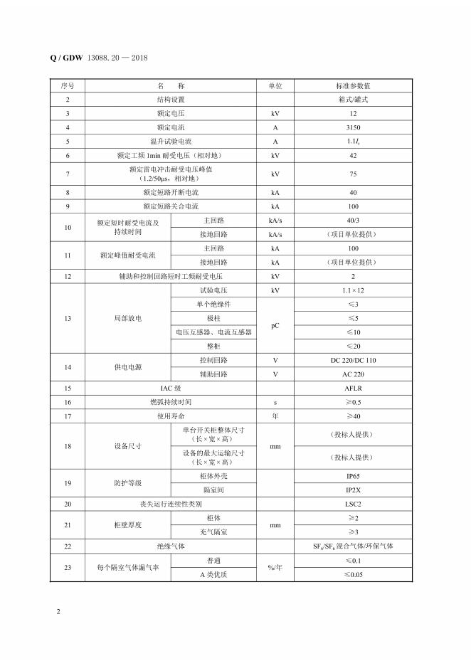 Q/GDW 13088.20-2018 12kV~40.5kV高压开关柜采购标准 第20部分:12kV/3150A~40kA充气式高压开关柜专用技术规范