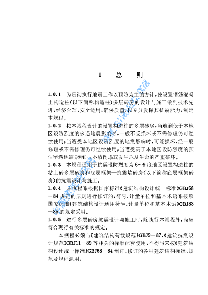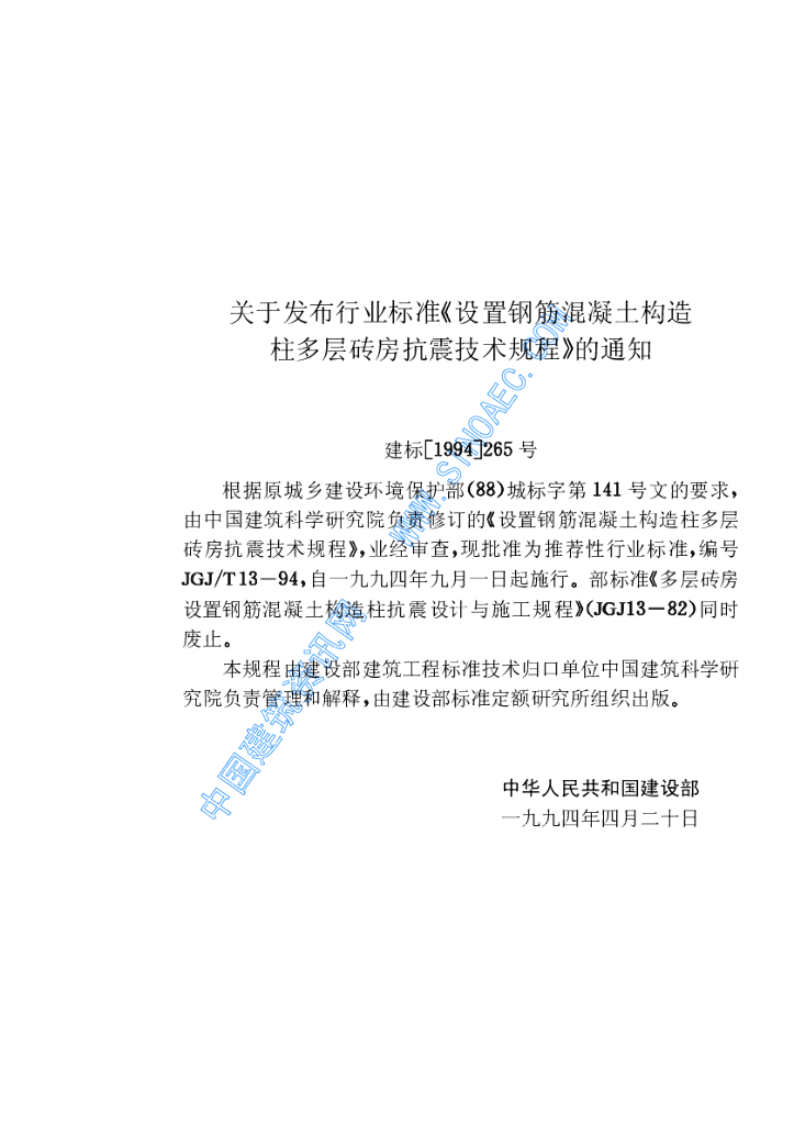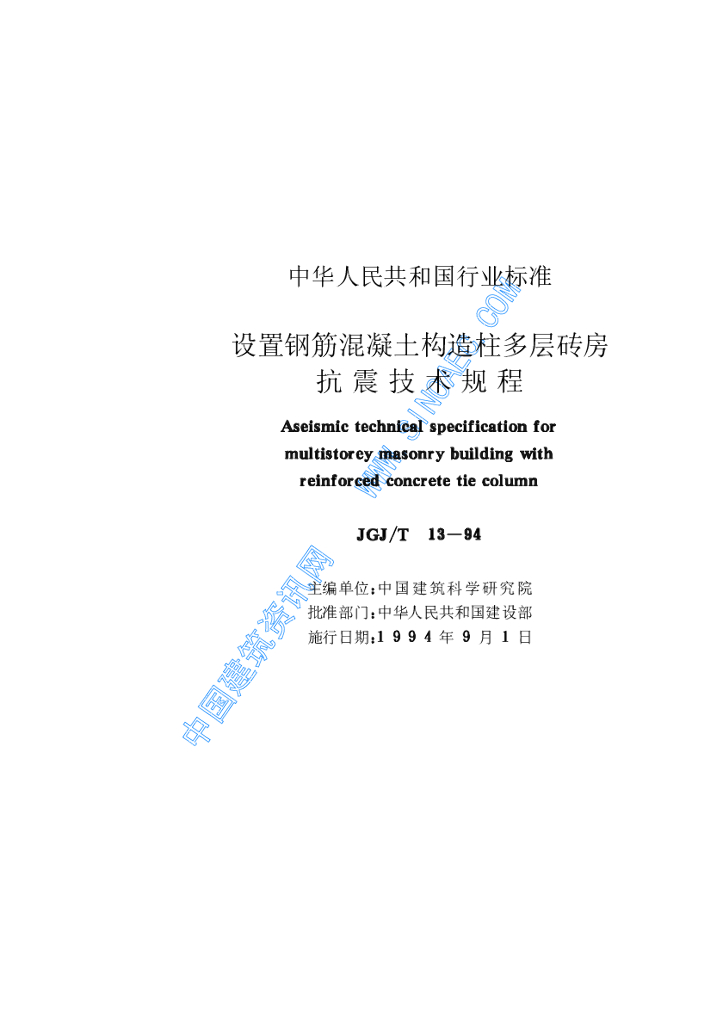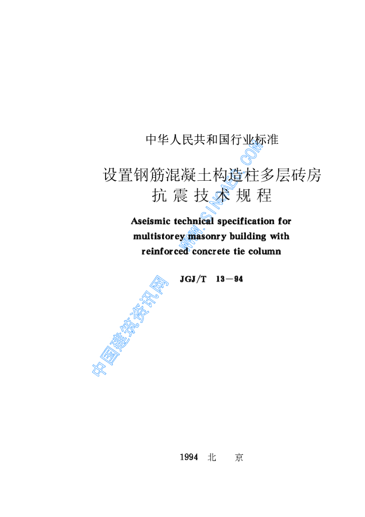 JGJ/T 13-1994 设置钢筋混凝土构造柱多层砖房抗震技术规程