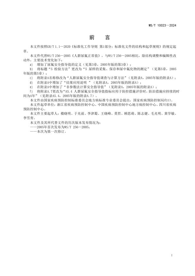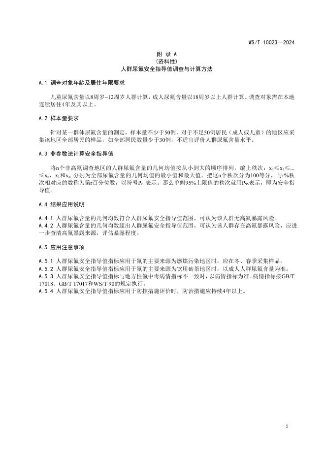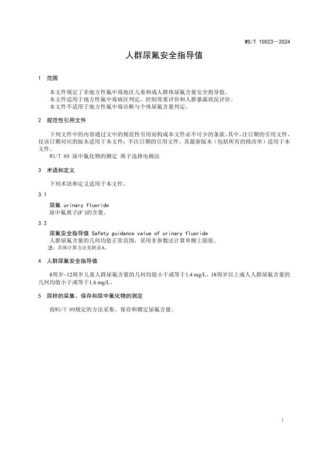 WS/T 10023-2024 人群尿氟安全指导值