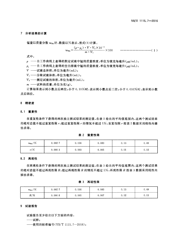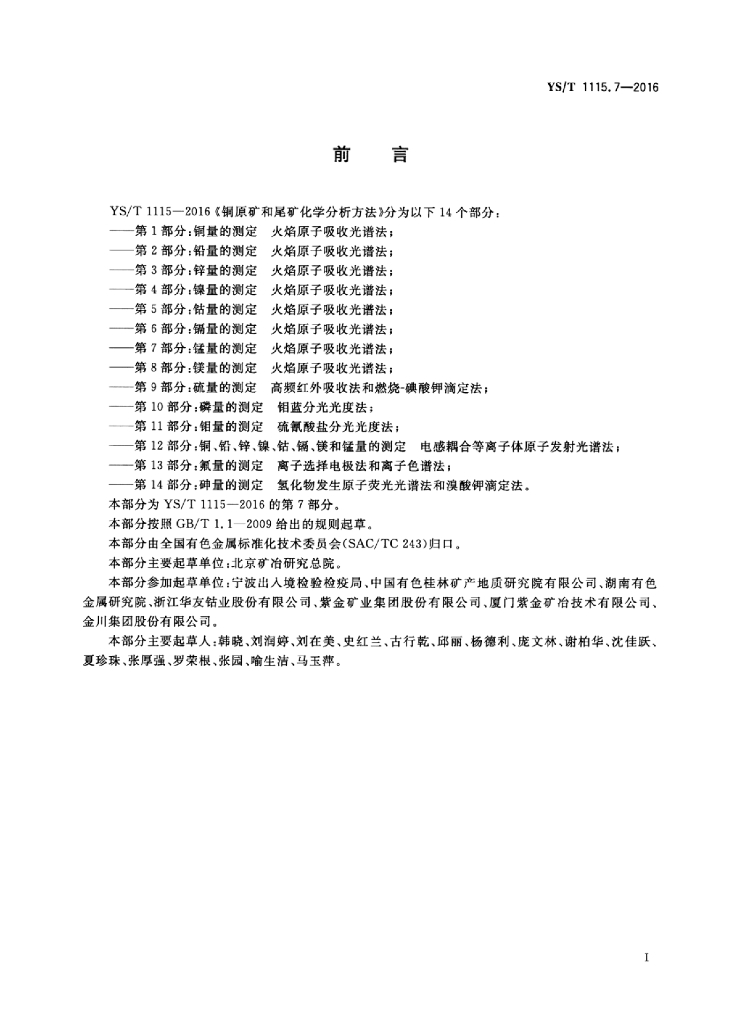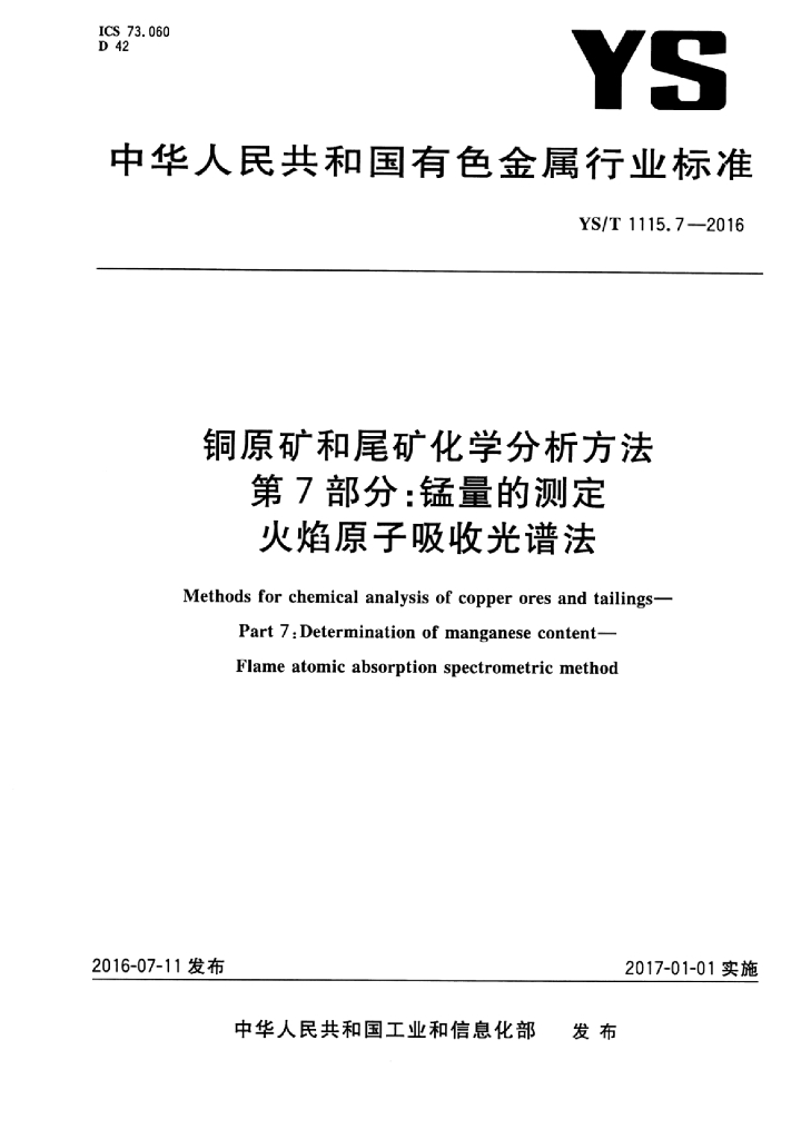 YS/T 1115.7-2016 铜原矿和尾矿化学分析方法 第7部分:锰量的测定火焰原子吸收光谱法
