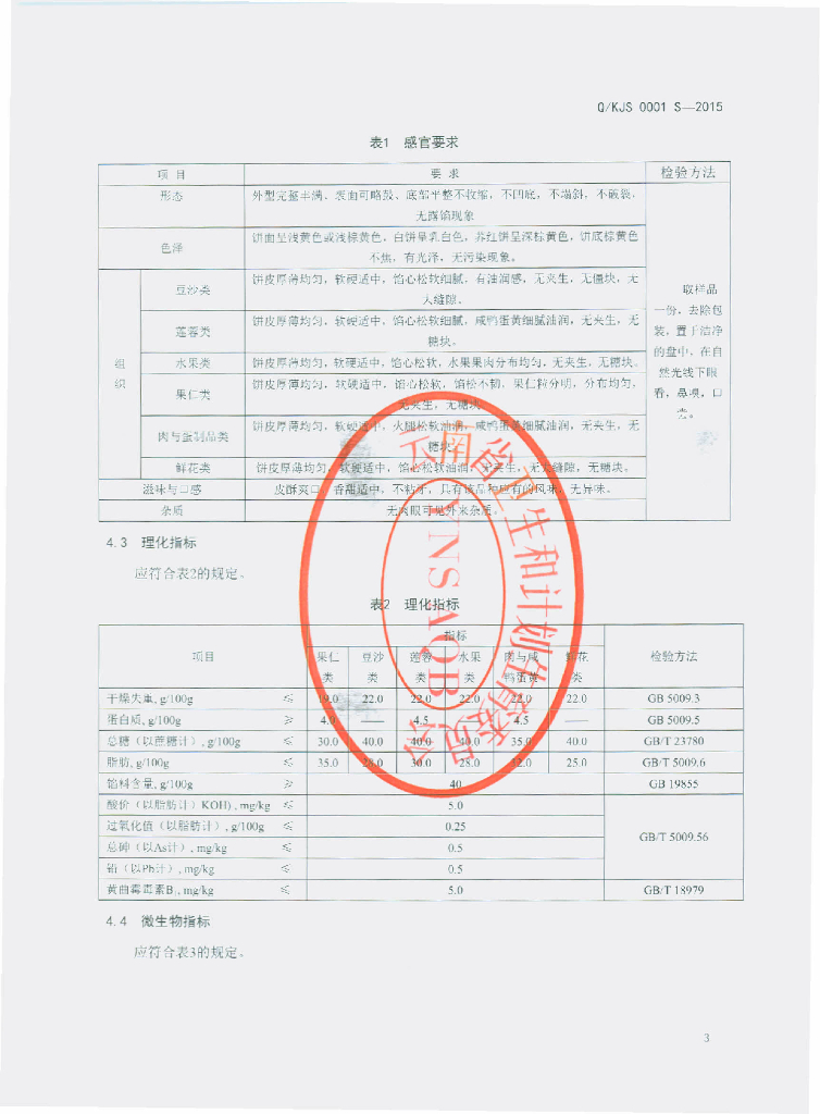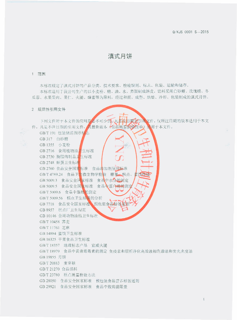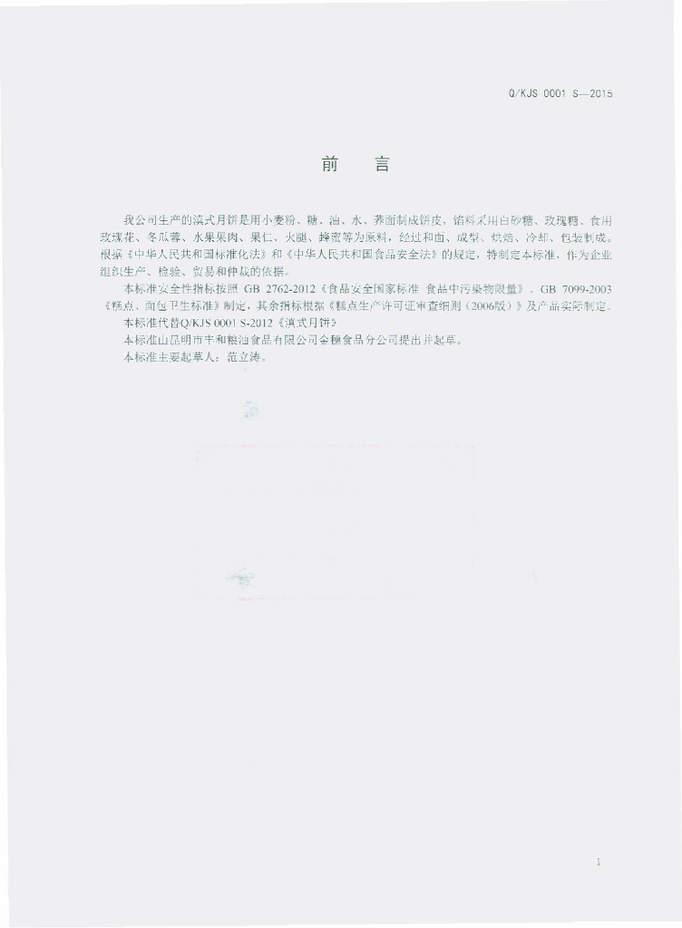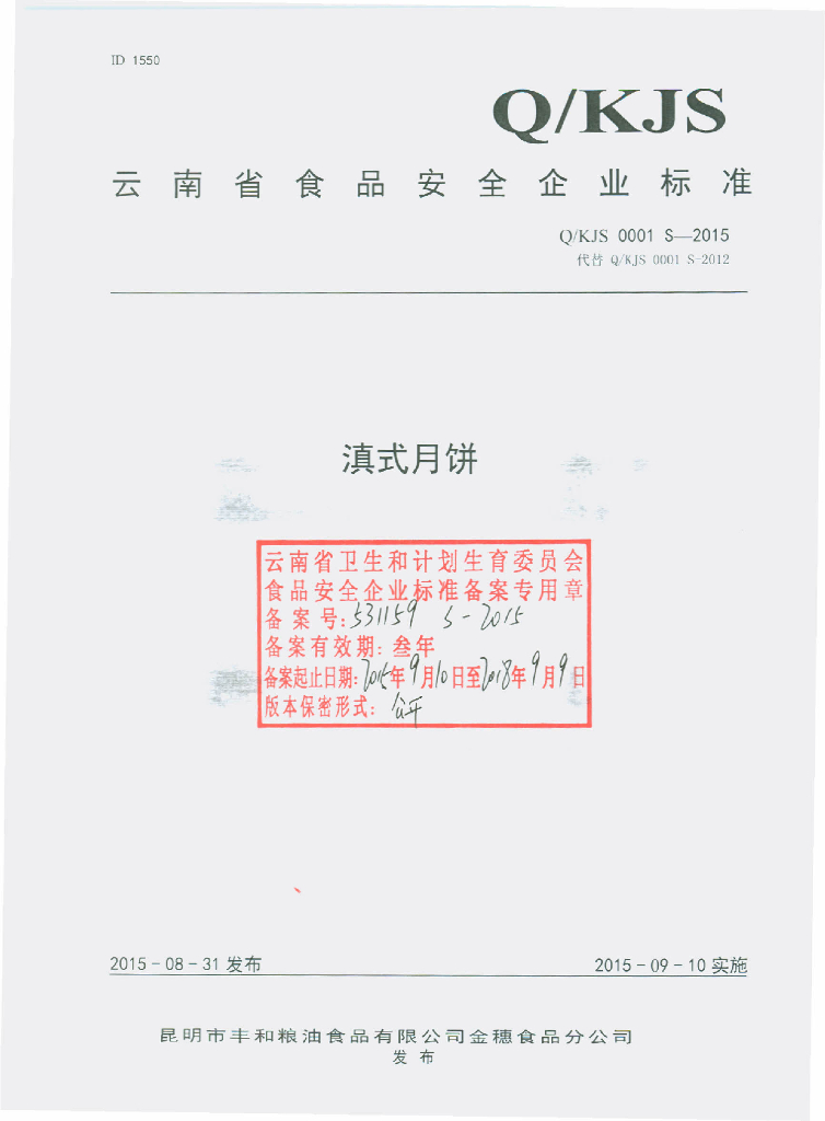 Q/KJS 0001S-2015 昆明市丰和粮油食品有限公司金穗食品分公司 滇式月饼