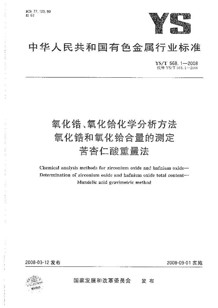 YS/T 568.1-2008 氧化锆、氧化铪化学分析方法 氧化锆和氧化铪合量的测定 苦杏仁酸重量法