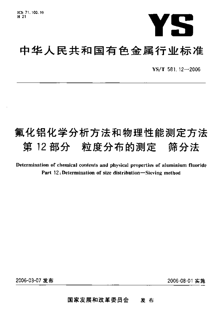 YS/T 581.12-2006 氟化铝化学分析方法和物理性能测定方法 第12部分:粒度分布的测定-筛分法