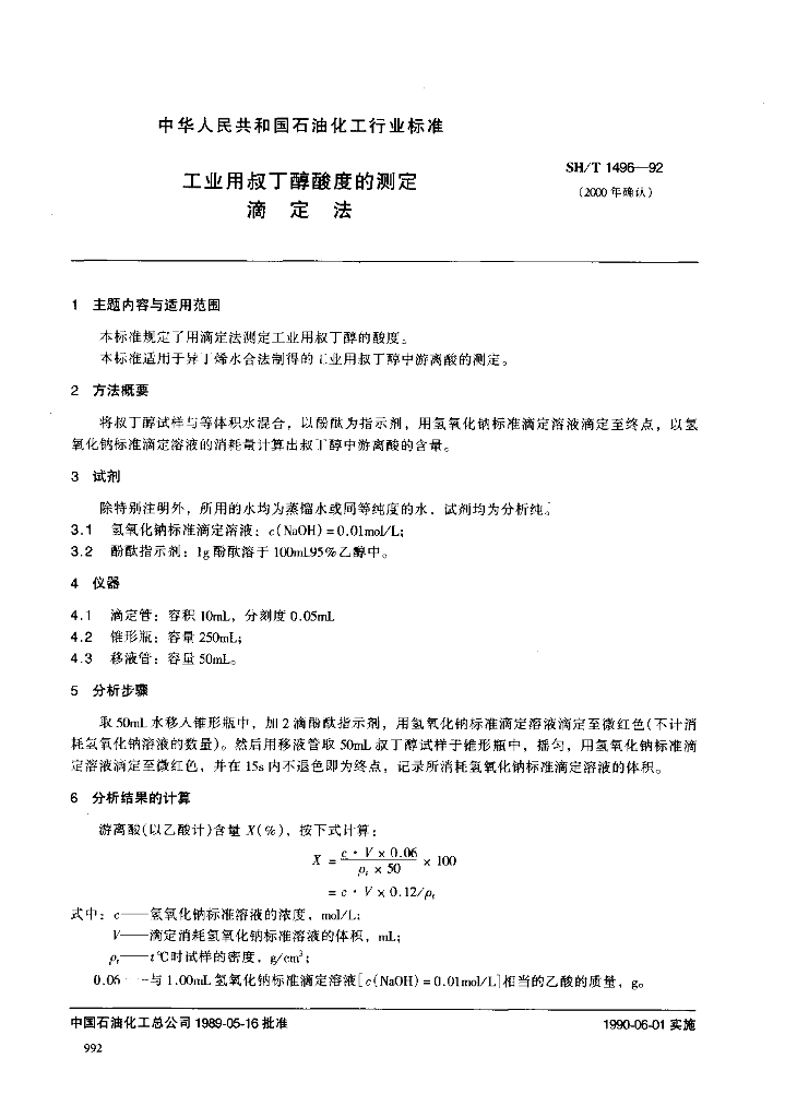 SH/T 1496-1992 工业用叔丁醇酸度的测定 滴定法