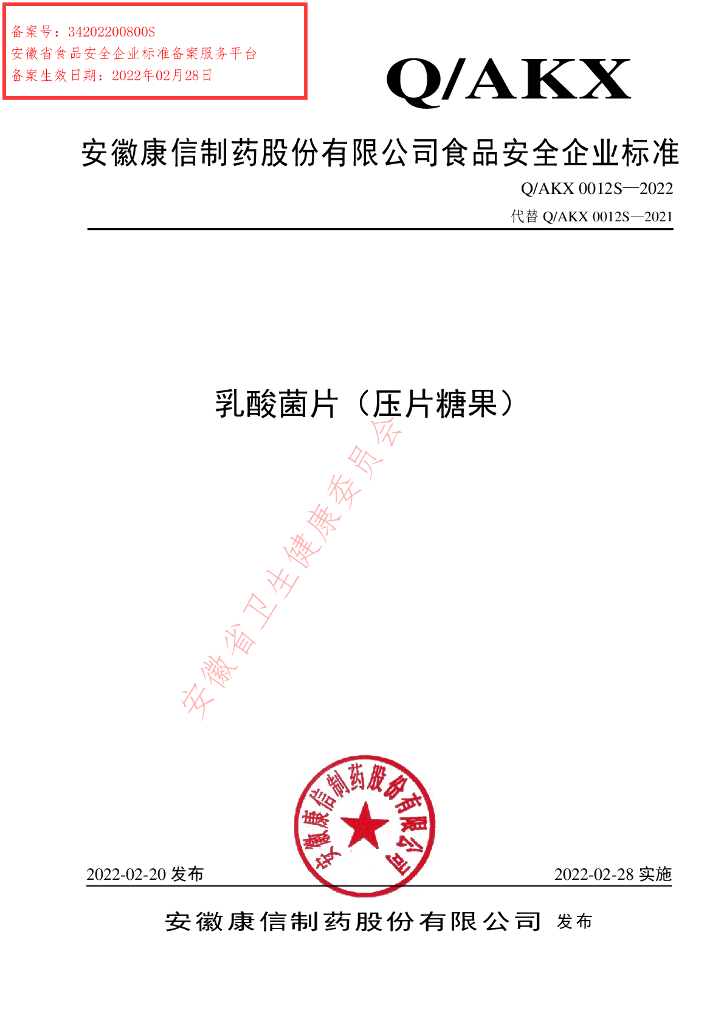 Q/AKX 0012S-2022 乳酸菌片(压片糖果)