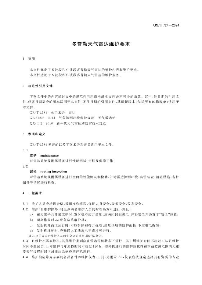 QX/T 724-2024 多普勒天气雷达维护要求