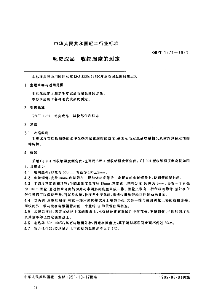QB/T 1271-1991 毛皮成品收缩温度的测定